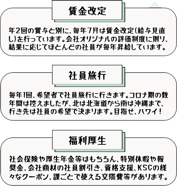 福利厚生 | 雇用保険・労災保険・健康保険・厚生年金・報奨金・社内商材の社員割引・資格支援・KSC・他 |