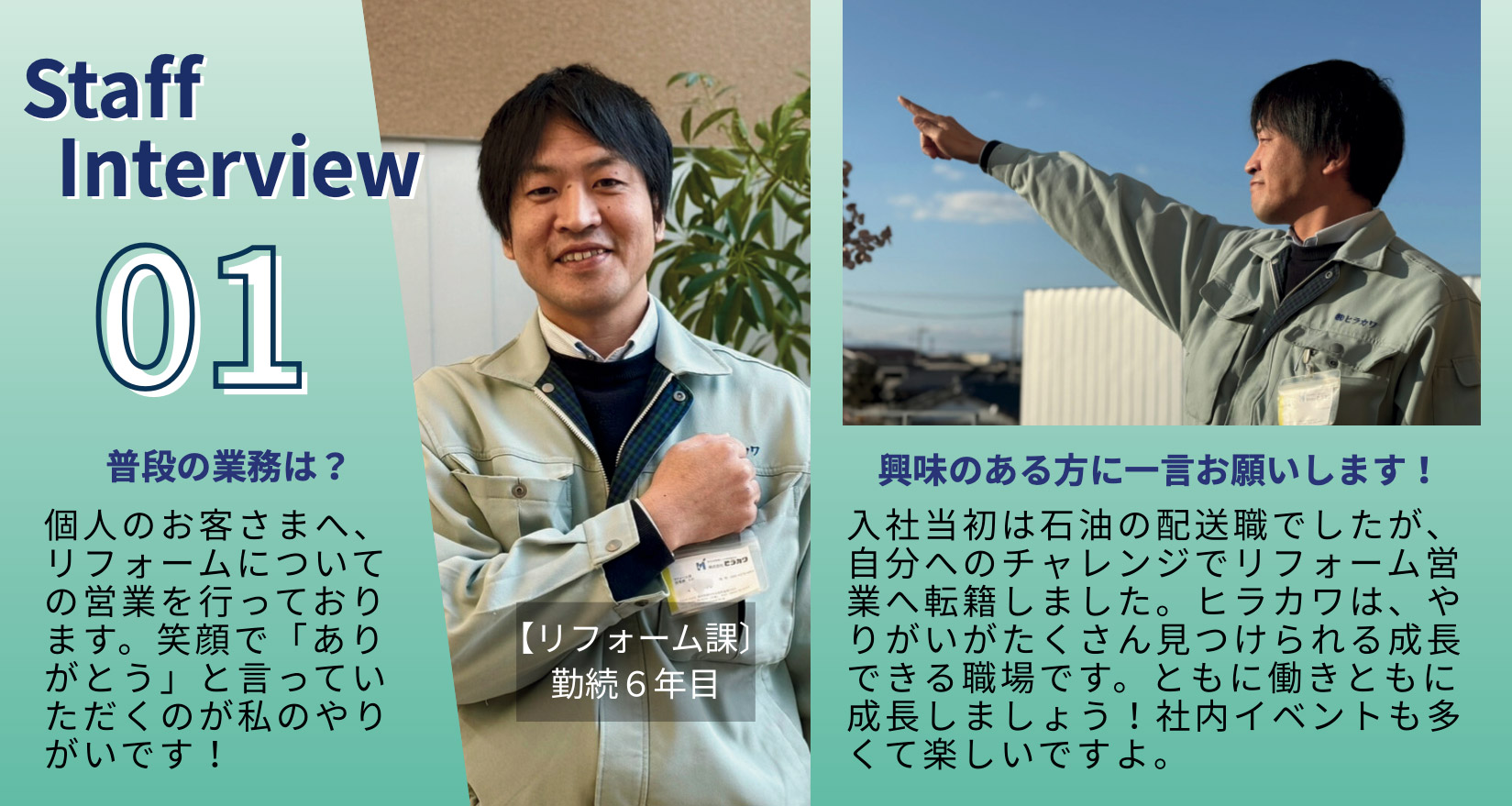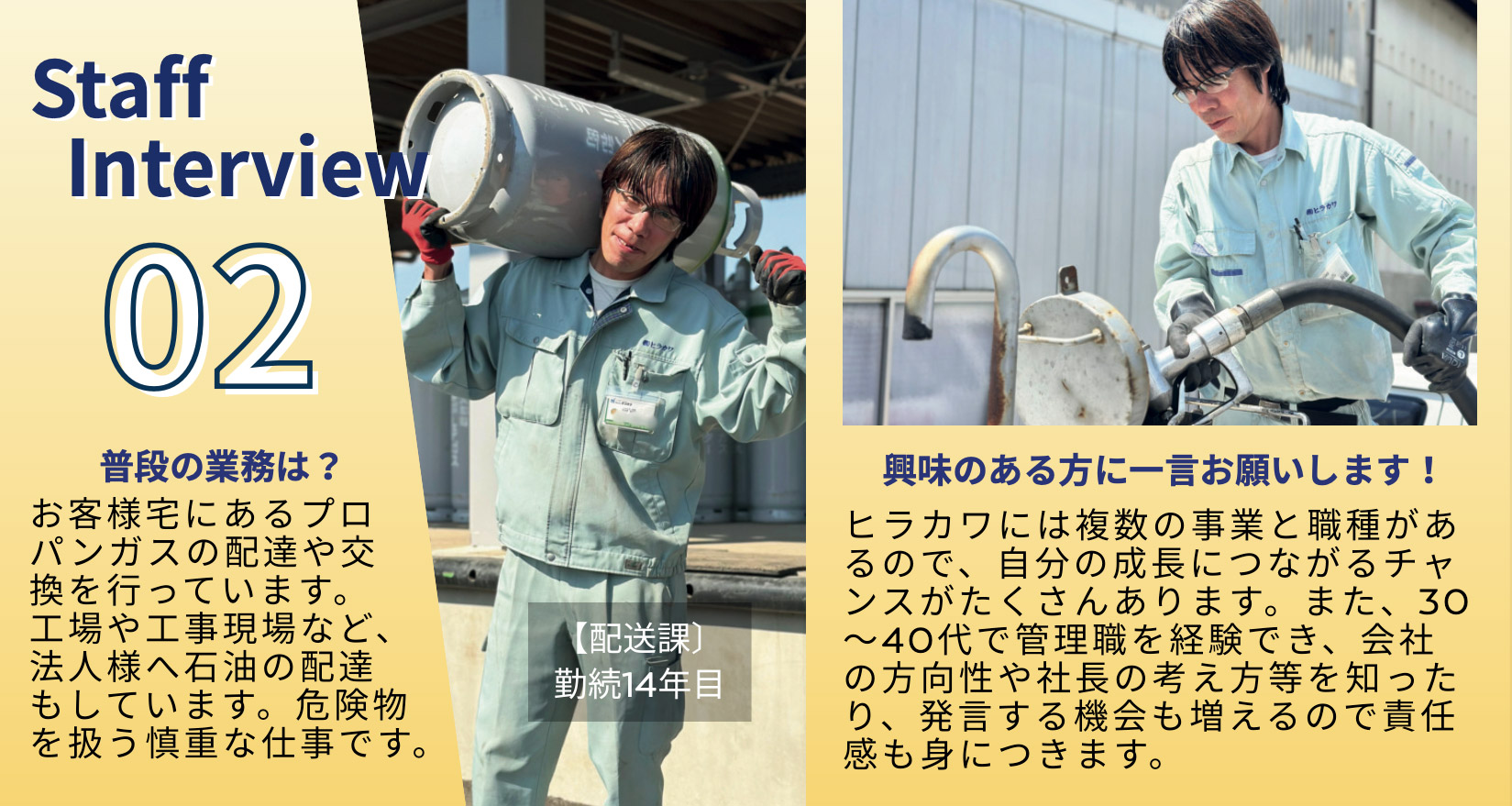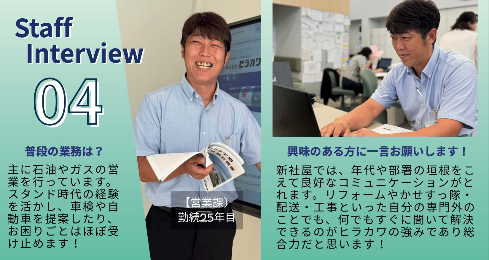 職種 | (1) 営業 LPガス・石油・リフォーム・自動車・家事代行等、弊社で取り扱う商材全般の営業 (2) 配送 LPガス・石油の配送業務(家庭用・業務用・現地等) (3) 配管工 住宅や店舗の水道管やガス管、空調設備管の施工等 (4) 整備士 自動車の整備・板金・塗装等 (5) SS ガソリンスタンドの営業・運営全般等 (6) かせすっ隊 家事代行の実施等 (7) 広報 チラシ作成・SNS投稿・HP修正・イベント企画等 (8) 経理 請求書発行、経理業務全般等 (9) 営業2 地域貢献事業における企画から実施、営業や集客等の運営全般 |